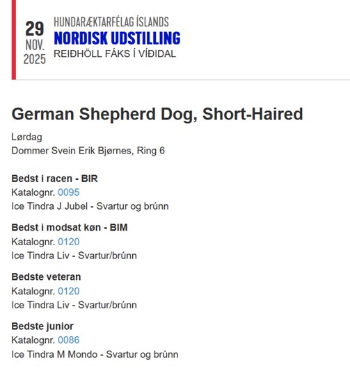 C.I.B-V ISVETCH ISVW24 C.I.E ISShCh ISJCh Ice Tindra Liv EX. 1.sæti CK meistaraefni- Íslenskt Öldungameistarstig ISVetCh- Reykjavíkur Winner öldunga RWV-25 titill og Norðurlanda Öldunga meistarstig NORDICVCH og er þetta hennar 3ja NORDICVCH öldungameistarstig og er því orðin