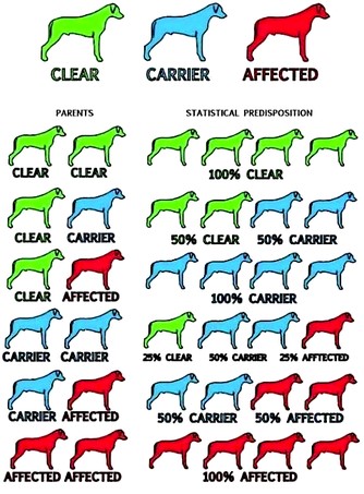 Þegar parað er saman hund sem er Beri við hund sem er Sýktur þá er tölfræðin að afkvæmin verða 50% Berar og 50% Sýktir.